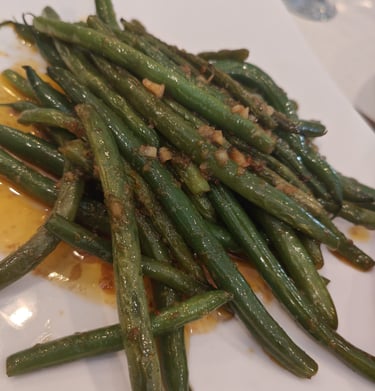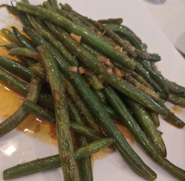 Fresh green beans with a BBQ twist — a little sweet, a little spicy, and finished with a gentle garlic kiss. A side that’s anything but ordinary.